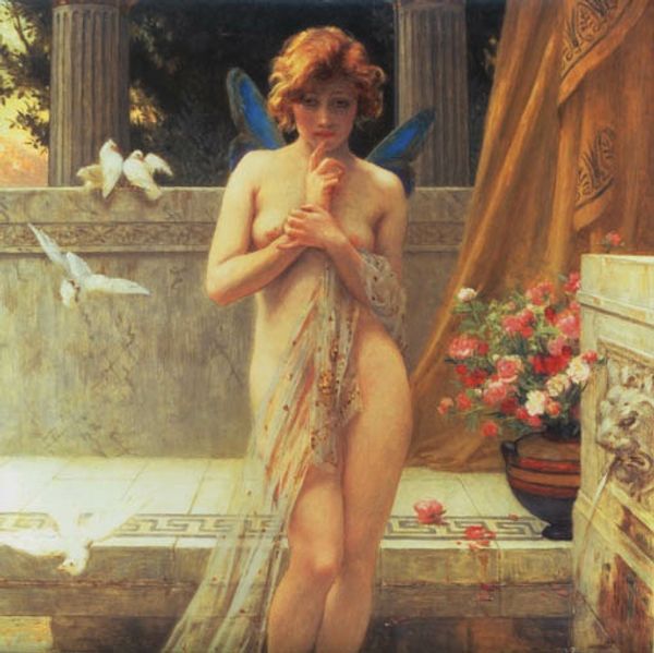Here, we see a painting by Guillaume Seignac titled ‘Une Beauté À La Source’. The composition immediately draws the eye to the serene figure of a woman, whose classical drapery and soft rendering give her a sculptural quality. Seignac balances cool and warm tones to create a sense of tranquil idealism. The light is diffused, casting gentle shadows that define the form without harshness. This aesthetic smoothness, however, also risks a certain artifice. The woman, posed at the fountain, seems less engaged with nature than placed within it. The painting's semiotic structure reflects a longing for the past. The classical garb and idyllic setting function as signs pointing towards an idealized antiquity, carefully constructed by Seignac to evoke a sense of timeless beauty. The question remains: what does this constructed image tell us about the values and desires of its own time? Ultimately, the formal qualities of Seignac’s painting, with its emphasis on idealized form and classical motifs, serve not just an aesthetic purpose but engage with broader cultural narratives about beauty, nature, and history.