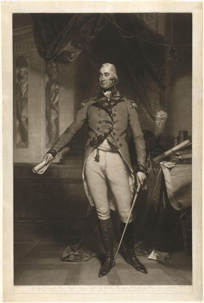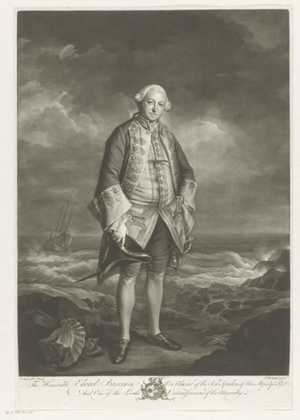 Curator: This is "Portrait of Adam Duncan," an engraving created in 1798 by James Ward. Editor: It strikes me as imposing, and somewhat romantic. The monochrome tones emphasize the rough seas behind him, contrasting the detail of the sitter’s dress. Curator: Absolutely. Ward created this print based on an earlier portrait to disseminate Duncan’s image widely, particularly after his victory at the Battle of Camperdown. Consider the role of printmaking in creating public heroes. Editor: I’m curious about the actual engraving process, since prints allowed for a new sort of consumption of images, but would this have also changed how artisans worked in this period? I mean, engraving plates takes a certain kind of specialist labor, doesn't it? Curator: Yes, specialized labor in this period led to a greater understanding of images being more and more a sort of common thing – less sacred or unique. This print would have been relatively affordable, thus it could be enjoyed by a broad section of society, thus shaping popular sentiment regarding naval power and Duncan himself. The mass production is directly tied to how accessible imagery was becoming. Editor: The print’s mass availability, almost a type of propaganda, played a role in shaping Duncan's legacy. Consider how social and political conditions shape not only what art is made but how it's distributed and received. Do you agree it’s like early social media influencing culture at scale? Curator: In a way, that's right, but unlike algorithms today that tend to change taste more organically, prints offered up concrete political messages. In contrast to painted portraits for the elite, prints became potent political tools shaping British identity during a time of naval dominance. I still think of all that specialist labor required to engrave those lines. The print is not just about image, it's also about manufacturing objects, its a type of industry as much as artistic creation. Editor: This makes one appreciate not only the artistry and production, but also consider the mechanisms through which celebrity and hero worship were cultivated in that era. What a lot to take from a printed portrait.