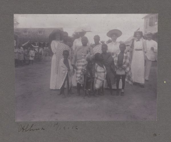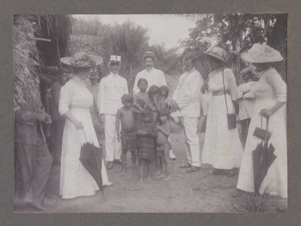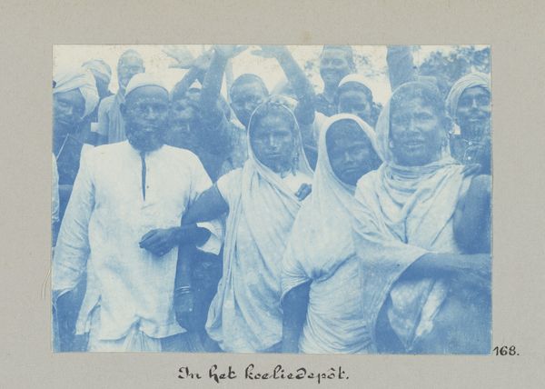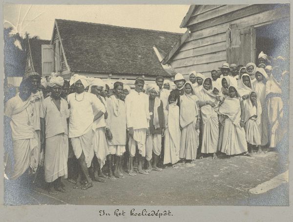 Curator: This is a photograph by Hendrik Doijer, taken between 1903 and 1910, titled "Hindostaanse contractarbeiders in het immigrantendepot," and rendered as a gelatin silver print. It portrays a group of indentured laborers in what appears to be a holding area. Editor: My immediate reaction is one of subdued melancholy. The sepia tones lend it an air of antiquity, but it's the collective gaze of the subjects—or rather, the avoidance of it—that truly strikes me. It’s a powerful, albeit subtle, representation of displacement and perhaps, even resignation. Curator: That downcast gaze you noticed speaks volumes. There’s a palpable sense of detachment. The visual weight of their traditional garments, contrasting against the stark, impersonal backdrop of what I read as an immigrant depot, heightens that feeling of alienation and cultural displacement. Their clothes act as visible signs of origin amid the disorientation. Editor: Absolutely. The photo becomes a visual document of the indentured servitude system. I see the layered complexities of colonial power structures at play. It forces a dialogue around exploitation, labor, and the ways in which identities were reshaped by these historical forces. What visual cues point you to a story of indenture? Curator: A close inspection of their clothing reveals much. Note the variations in dress and adornment. They serve as echoes of specific regions within India, speaking to diverse origins brought together under the singular experience of forced migration for labor. It almost seems as though, here in this transit place, cultural markers still retain symbolic value. Editor: Yes, it makes me consider how people reconstruct community and shared culture under oppressive conditions, or while being stripped of existing identities, even. It's a portrait of a group suspended in a state of liminality—between worlds, between identities. And also how documentary photography itself can carry cultural biases. Whose eye captured this image, and what agenda might it have served? Curator: It is difficult to overlook the nuances of power imbued in the act of image-making. How might their story be visually retold today, acknowledging historical dehumanization and cultural resilience? Editor: Well, hopefully, this photograph is an archive that lets the present look back, confront, and work towards disrupting any continuous manifestations of the past. It offers more than a somber look; it should fuel questions about justice, historical responsibility, and solidarity with all communities touched by the violence of exploitation. Curator: An important image for all its emotional, social, and artistic value.