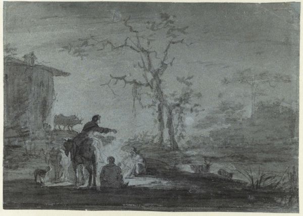 Curator: This intriguing work, titled "Night Landscape with Farmhouse and Skaters," crafted between 1761 and 1784, offers a glimpse into a world steeped in atmosphere. The artist, Johannes Janson, rendered this landscape in ink, creating a drawing now held at the Rijksmuseum. What are your immediate thoughts? Editor: Moody! It's incredibly evocative, like stepping into a half-remembered dream. That ghostly light against the dark sky makes everything feel so fragile and ethereal. Almost unsettling, yet somehow comforting, like an old story retold. Curator: That emotional resonance you describe points to how Janson effectively uses the interplay between light and shadow. Note how the moon, veiled behind the clouds, serves as both a light source and a symbolic presence. It evokes a certain pre-Romantic sensibility. Editor: It's more than just pretty light though, isn't it? The way the farmhouse huddles against that looming sky, almost pleading for protection... There’s a visual narrative here. It's telling a tale about shelter, about surviving the night. Also, I notice what looks like a figure squatting on the shoreline in the lower left? He seems almost ominous. Curator: Good eye. Genre scenes often carry coded social or moral messages. The presence of figures engaged in their nightly routines subtly invites reflections on community, labor, and humanity's relationship with the land. Consider also how winter landscapes served as metaphors for both hardship and the potential for renewal. Editor: Renewal! Yes! Maybe that’s why it’s not entirely gloomy. Even with the skeletal tree and dark farmhouse, the skating figures have an undercurrent of… what, resilience? Like life just stubbornly insists on going on, even under the darkest of skies. It reminds you that even stillness has momentum, you know? Curator: Precisely! By synthesizing landscape with elements of genre and possibly history painting, Janson elevates a simple scene to an expression of enduring human experience. The cultural memory embedded in everyday actions persists throughout generations, especially represented through the ice skaters, despite a dramatic sky looming overhead. Editor: Well, now I see more than just a pretty picture. I’m seeing history, a human story, etched in ink under a sliver of moonlight. Curator: It’s a compelling synthesis of art and culture, don't you agree? Editor: Definitely food for thought – even after the moon sets.