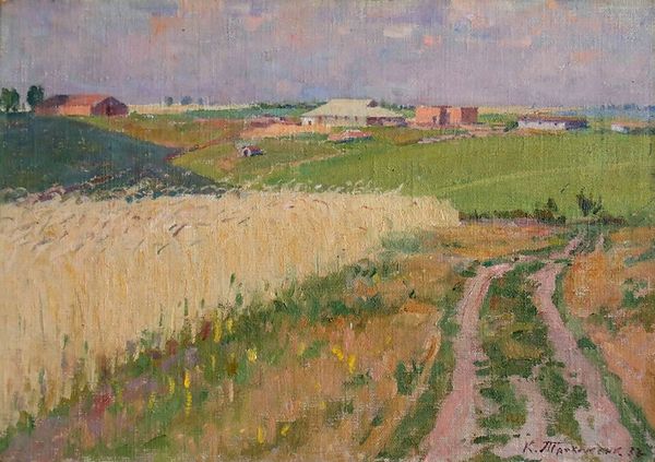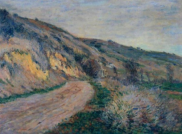 Editor: Here we have Camille Pissarro’s “The Dunes at Knocke, Belgium,” painted in 1902. It’s an oil painting that feels incredibly… open. There's such a feeling of expansive space and light in this landscape. I'm really curious about how someone else interprets it. What strikes you about this piece? Curator: It's a view that breathes, isn’t it? I see Pissarro, at the twilight of his career, almost dancing with the transient effects of light. Look how he renders the dunes. They're not static, sandy hills but alive with vibrating colour. Think of him, *en plein air*, wrestling with the wind and ever-shifting sun, capturing not just what he sees, but the very *feeling* of being there. Doesn't it remind you a little of childhood summers and lost freedoms? What do you think about his palette choice here? Editor: The colors feel surprisingly muted for an Impressionist painting, more earthy, perhaps. It's less about the vibrant hues and more about subtle gradations. Almost more…realistic? Curator: Yes, it's realism tinged with a poet's eye. Pissarro never fully surrendered to fleeting sensation; he wanted solidity. These dunes, though painted with broken brushstrokes, feel grounded, timeless. The homes nestled in the distance seem almost like an invitation. Have you ever wanted to just step into a painting? Editor: Absolutely! I think that’s why I’m drawn to landscape art in the first place. Now I’m viewing those muted colors as something that maybe capture the grittiness of a coastal scene instead of the glamourized or romantic. Thank you. Curator: Exactly! It is an exercise in observation. Something I will be thinking about the next time I find myself out in a beautiful space.