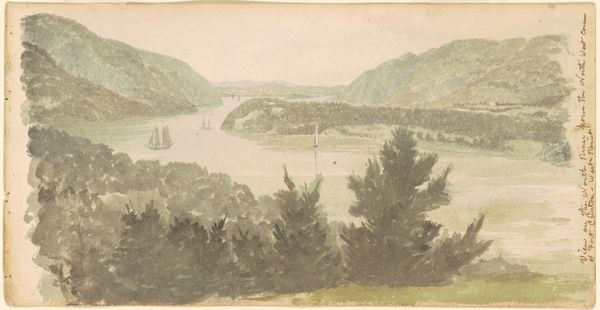 Editor: This watercolour, "Aggershuus Slot, bij Oslo, aan de fjord gelegen," dating from between 1850 and 1900 by Christian Eriksen Skredsvig, depicts a tranquil landscape. I’m immediately drawn to the soft blues and greens. It feels so serene. What's your perspective on this work? Curator: Oh, it whisks me away to a quieter time. It's more than just a pretty picture, you know? Think of the Romantics, yearning for nature, for the sublime. This watercolour is like a little poem. Do you notice how the artist uses light to create such a feeling of distance? That fading, dreamy effect. Editor: Yes, the subtle gradation almost makes the background disappear. It does add to the peacefulness. Was the artist a fan of Turner, perhaps? Curator: Ah, a sharp eye! Turner’s influence is definitely a whisper in the wings here, that masterful play of light and atmosphere, absolutely. But Skredsvig adds his own Nordic touch, a certain… stillness, don’t you think? It lacks Turner's bombast, settling instead for introspection. Editor: I see what you mean. It's grand but still intimate. I never really thought of Romanticism as something quiet, but this shows me a different side of it. Curator: Precisely! And isn't it lovely how a single artwork can reshape our perceptions? The beauty lies in those subtle shifts, that gentle prompting to reconsider what we think we know. It is those quiet, reflective works that often linger in our minds. Editor: That's a really interesting point! I’m definitely going to be looking at Romanticism differently from now on. Thanks!