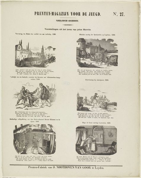 Curator: Editor: Right, so here we have "Tafereelen uit den tweeden stadhouderloozen tijd, en het stadhouderlijk bestuur van Willem IV en Willem V. 1702-1795," a print made in 1844 by Jan Schuitemaker. It strikes me as a historical record, like an illustrated news pamphlet almost, documenting various events with these little scenes and poetic captions. What catches your eye? Curator: What indeed...it almost looks like an antique version of comic strips, a precursor of sorts! And each frame... a tiny window into Dutch history. I see storms at sea, political upheaval... glimpses of the ordinary mingling with grand pronouncements. But tell me, what mood does this conjure for you, and what scenes resonate loudest? Does it echo what you have studied of the period? Editor: I find the overall composition a bit busy but there are a few engravings that evoke feelings of uncertainty and conflict, and also societal upheaval during the reign of Willem IV and Willem V. Knowing what the Dutch Golden Age means... perhaps what seems at first so busy it tells of vibrant life? Curator: Precisely! And look closer; there’s an incredible level of detail. Schuitemaker has distilled grand historical moments into miniature dramas, filled with characters, each frozen in time...almost as if these moments have now escaped the clutches of time! Are they truly history any more...do these snippets of moments still exist. If you could reach in there, into one of those tiny tableaux, which would you choose and why? Editor: Perhaps the storm at sea! I am quite landlocked, the notion of sailing, adventuring is enticing! Curator: Excellent choice! So what do you take away from examining this old 'newspaper' together? Has this altered how you perceive narrative art or historical documents? Editor: It makes me appreciate how even seemingly simple images can hold so much historical weight and can bring to life past events. Almost like little portals!