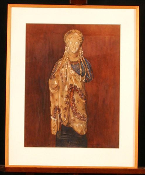 Curator: Before us, we see Marie Henriques' 1934 lithograph, watercolor, and print titled "Arkaisk græsk Kore (Athen)," which translates to "Archaic Greek Kore (Athens)." Editor: There’s something unsettling and washed-out about it, almost ghostly, but with these carefully delineated, colorful decorations across her garments, which pop up from a more faded, blurred style. It is an ambiguous mix. Curator: It is fascinating how Henriques chose to portray this kore. In ancient Greece, kore statues served as votive offerings or grave markers, imbued with societal expectations for young women. What does it mean when a modern artist reproduces a figure so thoroughly shaped by cultural constraints? Editor: Reproduction is an apt term, because you immediately zoom into symbolism when the materiality interests me more. Look at the lithographic lines mimicked by the brushstrokes to give an impression of both permanence and impermanence. Is this, maybe, hinting to how these cultural constraints persist over time? Curator: I think so. By recreating this statue using accessible printmaking techniques and the intimate medium of watercolor, Henriques democratizes an emblem of elite ancient society. Editor: Right, because consider the labor! To produce the original sculpture from stone was expensive; Henriques creates with watercolor a potentially endless number of copies available for display. But why evoke such an ancient image through such labor and medium? Curator: Marie Henriques moved within intellectual circles engaged in reassessing classical ideals and how they shaped Scandinavian identity. This artwork likely participates in those discussions, asking whether we ought to preserve ancient power structures in modern society or create alternatives. Editor: A fascinating interpretation through material acts! A reevaluation of ancient production processes, making its cultural weight newly available and questionnable, literally printed into new existence by modern means. Curator: Absolutely, it encourages us to contemplate our relationship with the past and consider its legacy on our current social landscape. Editor: Thank you. I'll be spending some time wondering at how the act of printing itself opens so much consideration of the statue's place and value.