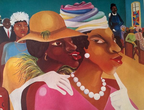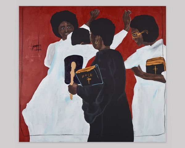 Editor: So, this is "The Reformation" by Lanise Howard, painted in 2022 using acrylic on canvas. I’m really drawn to how the figures are set against this seemingly vast, open landscape. It's almost dreamlike. What stands out to you about it? Curator: From a materialist perspective, the title "The Reformation" is a direct pointer to shifting social and material conditions. Consider the women's athletic wear: mass-produced, affordable fabrics and footwear – readily available commodities. Are they consumers of this culture? Producers? The tension between their individual identities and their conforming white attire reveals a critical commentary on both capitalism and group dynamics. Editor: That’s an interesting point. I hadn't thought about the clothing in terms of production. Does the landscape itself play a role in your interpretation? Curator: Absolutely. What materials were used to produce the pigment and canvas, and what were the historical uses of those materials? Furthermore, notice the seemingly untouched landscape contrasted with their outfits, hinting at a deeper societal engagement with the earth's resources. Is the artist proposing that the relationship between marginalized women and landscape, especially as commodities, are interwoven? Editor: It’s a bit unsettling to think about landscape as a commodity but, with this painting, that perspective does feel potent. Thanks, I will never see it the same way again. Curator: Exactly! I think we've just cracked the surface regarding the dynamic exchange and interplay between human elements and our resources in the artwork.