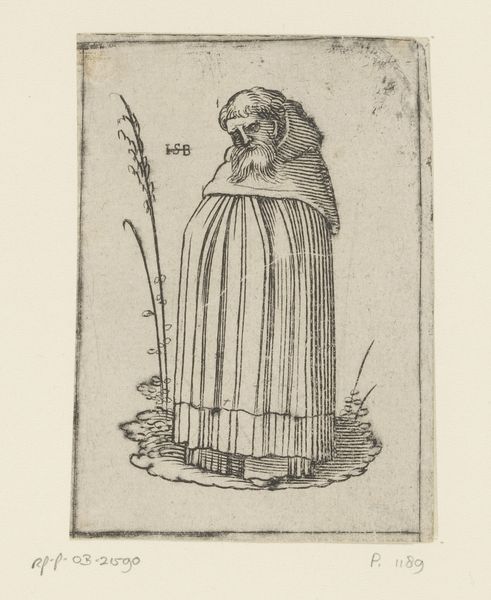 Curator: Standing before us is "Monnik van de orde der Sterrebroeders," or "Monk of the Order of the Star Brothers," an etching attributed to an anonymous artist, dating from after 1526. It's held here at the Rijksmuseum. Editor: My immediate impression is the stark simplicity. The lines are so deliberate, creating a mood of quiet solemnity. The subject's pose seems to beckon the viewer, even through the ages. Curator: Absolutely. Consider the printmaking process of etching, which involves using acid to bite into the metal plate. This method allowed for finer, more detailed lines than, say, woodcut, reflecting the growing sophistication of printmaking at the time and creating an ability to produce relatively cheap imagery to a bigger public. Editor: I’m drawn to the symbolism of the star emblem on his chest. What does it signify within the context of the Sterrebroeders? Does it point to some specific tenet or celestial connection within their order? The book he carries adds another layer—knowledge, faith, both perhaps? Curator: Likely both, though records of the Sterrebroeders are scarce now. Print such as this could also have acted as form of calling card, circulated amongst potential benefactors and new members of the Order. The level of detail in the fabric, created through cross-hatching, highlights the quality of materials that members of the order would have acquired through donations to the order itself. Editor: And his gaze. It feels incredibly direct, almost confrontational, despite the soft etching. The artist has captured a sense of inner strength and purpose. This wasn’t just a record, this was meant to resonate. Curator: Agreed, it provides a sense of dignity despite his possibly meager circumstances. And perhaps what we interpret as inner strength was just meant to convey stability during a turbulent period. This etching would have acted as testament of devotion, materialized through the laborious method of etching. Editor: Well, regardless, for me this artwork invites questions of faith and belief. It really invites me to think about this individual monk's motivations, and those of the people he represented, and what he represents about us today. Curator: Indeed. The materials and process of creating "Monnik van de orde der Sterrebroeders" allow us insights into the social conditions surrounding its creation.
