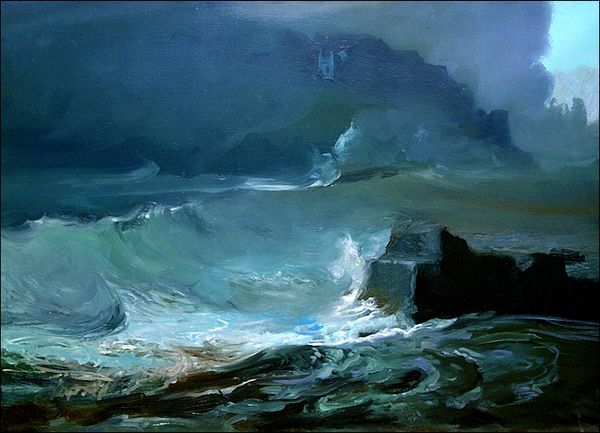 Editor: So, here we have Ivan Aivazovsky's "Sea" from 1895, rendered in oil on canvas. It's immediately striking, a seascape dominated by a stormy sky and turbulent water. The light feels almost theatrical. What story do you see unfolding here? Curator: I see a potent example of Romanticism's fascination with the sublime. Consider the context: Aivazovsky, a celebrated artist in Tsarist Russia, creates this dramatic scene. Think about the navy’s importance to Russia’s imperial ambitions. Do you see a glorification of nature’s power, or a commentary on human vulnerability against it? Editor: I lean towards vulnerability. The small shipwreck almost disappears amidst the waves, making me feel the vastness and indifference of the sea. Curator: Exactly. And how might this painting be received by different audiences? A wealthy St. Petersburg patron may admire its aesthetic qualities, perhaps as a status symbol reflecting power, while a sailor’s family may view it with trepidation. Do you see the duality in its public role? Editor: I do. It’s fascinating how the same image can hold such contrasting meanings depending on who’s looking at it. The institution of the art world shapes its reception. Curator: Precisely! The gallery itself, with its implied values of artistry, prestige, or even national pride, impacts the viewer's experience. Editor: This has given me so much to consider, how the historical and cultural landscape imbues a painting like this with far more than just what's on the surface. Curator: Indeed, recognizing the interplay between art, society, and its institutions offers deeper insight into art’s enduring power.