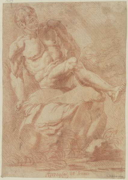 Curator: We’re looking at “Neptune” by Theodoor van Thulden, currently held at the Art Institute of Chicago. It’s rendered with pencil, chalk, and charcoal on paper, characteristic of Baroque draftsmanship. Editor: Immediately, I’m struck by how dynamic it feels for a drawing. It’s as if Neptune’s emerging from the depths, muscles tensed, ready to command the seas. Curator: The composition certainly directs the viewer's gaze upwards, emphasizing his powerful stance and billowing cloak. The interplay of red chalk and charcoal adds depth, highlighting the anatomical precision van Thulden was known for. Editor: Right, that anatomical rendering! And that fierce brow! The textures he’s coaxed from the charcoal create this sense of wild energy—not just power, but elemental chaos. There's also a sensitivity though. You almost forget about the phallic symbolism when caught by the gesture. Curator: Semiotically, the trident is paramount. It signifies Neptune’s dominion and alludes to the threefold nature of his power: controlling storms, calming seas, and commanding all marine life. The medium is also telling: drawing, rather than a more “finished” painting style, perhaps reflects Neptune's volatile essence. Editor: I like that. Volatile essence perfectly captures the spirit of this piece. You expect him to throw it! Not a very calming influence really. This is way more exciting than those statues you see sometimes. What a clever god: an artistic moment of explosive force, captured just before a storm erupts. Curator: Indeed. While its precise date remains unspecified, “Neptune” allows us to appreciate the artist’s deft mastery of line, form, and allegory within the Baroque idiom. The success relies in balancing artistic finesse with allegorical weight, achieving aesthetic harmony through dynamic tension. Editor: Van Thulden makes you feel that the ocean god could just be here in the room—that this drawing isn’t just ink and chalk, but an echo of oceanic vastness. We can almost feel its spray in the air, as the ruler emerges ready to make a big, unforgettable splash.