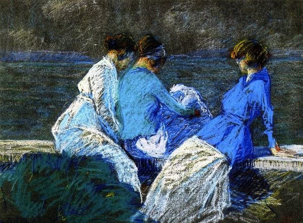 Curator: Painted in 1891 by Camille Pissarro, this oil on canvas work, titled "Haymakers Resting," offers a glimpse into rural life, depicting three women taking a break from their work in the fields. Editor: My first impression is one of quiet exhaustion and sisterhood. The figures, while detailed, seem to blend into the very earth they rest upon. There’s a certain muted color palette, creating a calming and almost dreamlike state. Curator: It’s intriguing to consider Pissarro's social commentary here. In the late 19th century, rural life was undergoing dramatic changes, and works depicting laborers, especially women, held significant weight. They bring attention to a specific gendered division of labor. Do we consider this work through a socialist feminist lens, then, and critique the art market? Editor: I see how this invites us to consider broader societal shifts. And to follow that, if we consider their clothing, there are only minor individualized traits or color selections within them. Beyond practicality, might their clothing express an implied community or collective? Curator: Exactly. The style certainly lends itself to the interpretation, and to a point, their anonymity does raise interesting questions about class, representation, and the male gaze within the Impressionist movement. Pissarro always seemed interested in that struggle to render people as unique, or to blend them into an idea of the times. Editor: Speaking of anonymity, observe the figure in the vibrant red garment. Although her face is obscured from us, the image of a traditional pastoral Madonna comes to mind, but transposed within a secular and quotidian context. The covered head can have a dual meaning of deference and social class at the same time. Curator: And the other two figures’ dresses in paler, earthy blues perhaps indicate a hierarchy or at least a division of labor within the group. It is fascinating to witness this interplay between the symbolism of the garb, the field of labor itself, and their shared place within a cultural history of art. Editor: Thinking of visual heritage, it all coalesces into a potent blend of timeless archetype with localized social awareness, and I'm always struck how art carries echoes of our shared past in these quiet, observant forms. Curator: Precisely. By considering the confluence of class, gender, and social structures in Pissarro’s era, this seemingly serene pastoral scene sparks very profound inquiries regarding those still visible societal divides today.