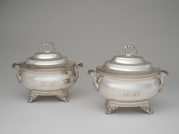 Curator: Good morning, everyone. We're standing before a pair of silver breakfast dishes, dating back to around 1830. Editor: They’re surprisingly imposing, aren't they? Cold, almost metallic moons reflecting no human warmth. Curator: Let's deconstruct this impression. The material itself—silver—already presents inherent qualities: reflectivity, malleability. Observe how the artist uses repetitive fluting on the dome of each piece, and the delicate beading outlining each form. These techniques speak to broader trends. Editor: Baroque influence for sure – look at those fleshy floral motifs circling the tops. Such blatant displays of wealth seem…performative. Breakfast becomes a staged ritual with objects like these. Silver's been linked for centuries to lunar deities, fertility – associations of purity and even aloofness resonate here. Curator: Fascinating insight. Structurally, notice the concentric circles—the round base supporting the tiered lower section, then the curvature of the domed lid crowned by the finial. This design lends a feeling of formal balance but consider also how these levels draw the eye upwards and give these utilitarian items a monumental feel. Editor: Function transcends its purpose. Serving dishes become symbols of domestic control, of power structures playing out even over the breakfast table. This echoes the rise of the bourgeoisie – hungry to display its newfound riches in every conceivable setting. Curator: True. These dishes can be analyzed from material standpoints. We observe how the metal has been manipulated, formed and finished, and can look deeper into symmetry and form within Baroque stylization, but we also recognize the era’s fixation on aestheticizing every part of life, of using decorative items to assert privilege. Editor: Exactly! It’s where surface and deeper meaning intersect. Seeing these in the museum forces us to think how an ordinary object turns into a cultural artifact. Curator: A perfect reminder: these seemingly inert items serve as time capsules, giving glimpses of a very particular chapter. Editor: Absolutely. A morning meal now tinged with symbolism.