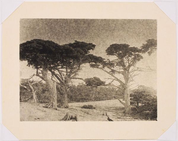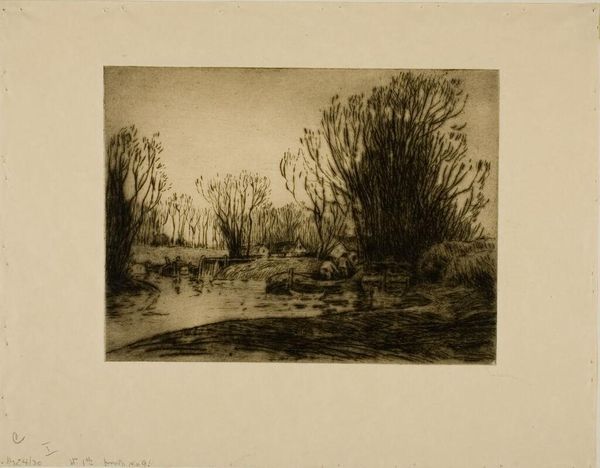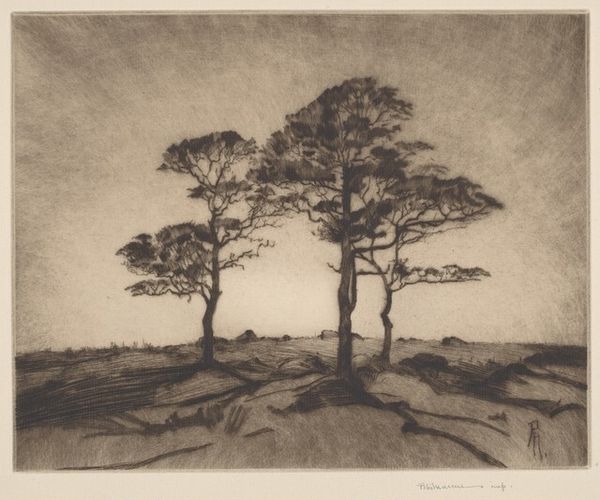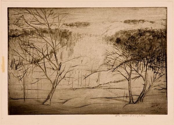 Curator: This is Alexander Shilling's "Trees," currently held at the Harvard Art Museums. There's no specific date assigned, but Shilling lived from 1859 to 1937. Editor: It feels like a memory, doesn’t it? The trees are almost like ghosts lining a path I've walked a hundred times in a dream. Curator: The monochromatic palette really contributes to that sense of nostalgia, I think. And the density of marks in the foreground pulls the viewer right into that winding path. Editor: Exactly. It’s not just about showing trees, it's about feeling the stillness before a storm or that golden light just after one. It's more than just trees, wouldn’t you say? Curator: I'd agree. Shilling manages to imbue this seemingly simple landscape with a rich emotional depth. Editor: It’s funny how a simple image can speak to so much, isn't it? Curator: It is. Seeing it this way gives the piece a new dimension for me.