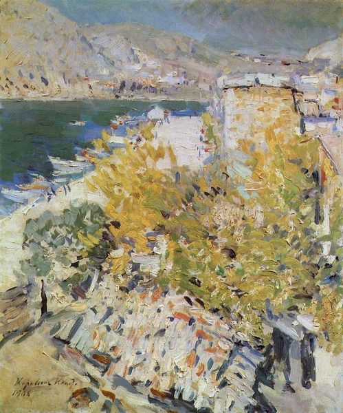 Curator: Immediately, the starkness hits me. The sky is a flat, almost oppressive blue, dominating everything. It feels less inviting than you'd expect from a Mediterranean scene. Editor: Indeed. What we're seeing here is Henri Matisse's "La Promenade des Anglais," painted around 1917. It’s a striking example of his post-Impressionist explorations. Notice the visible brushstrokes in the plein-air technique. Curator: It's interesting how he’s rendered the figures – or rather, the suggestions of figures. They’re just blobs of paint, anonymous and somewhat lost against the landscape. Are they observers or are they part of a different narrative about tourism and public spaces during that era? Editor: I see the people and think about the political climate of France during the Great War. Though Nice wasn’t on the front lines, the anxieties of the time likely seeped into even the brightest landscapes. Was the 'Promenade' itself meant for leisure or became more complicated by the socioeconomic changes caused by war? Curator: Perhaps that somber mood isn’t so surprising, given the historical backdrop. The title speaks to leisure, but there is also a flatness to the scene and its activity; Matisse offers a visual record of people traversing public space during complex times, a space also occupied with collective anxiety about ongoing conflicts. Editor: The flattening effect that Matisse often uses really puts a sense of ambiguity to that feeling of being in public, where privacy is invaded, where one is seen but not engaged. The thick applications of oil-paint create such depth of colors, yet depth is reduced and space seems compacted by its textures. Curator: Yes. It disrupts that ideal of cheerful bourgeois life along the Riviera. Even the light feels heavy, lacking that crisp, sun-drenched quality we associate with the south of France. We get a raw emotional expression layered into this landscape through those painting choices. Editor: Absolutely, it's a perfect example of how context can profoundly shape our perception of art. We’re given a vision, via Matisse, that speaks volumes about the period. Curator: It makes you reconsider those stereotypical notions of leisure, reminding us that even postcard views can carry the weight of history and a visual statement on that climate.
