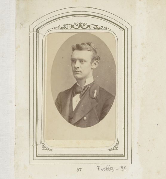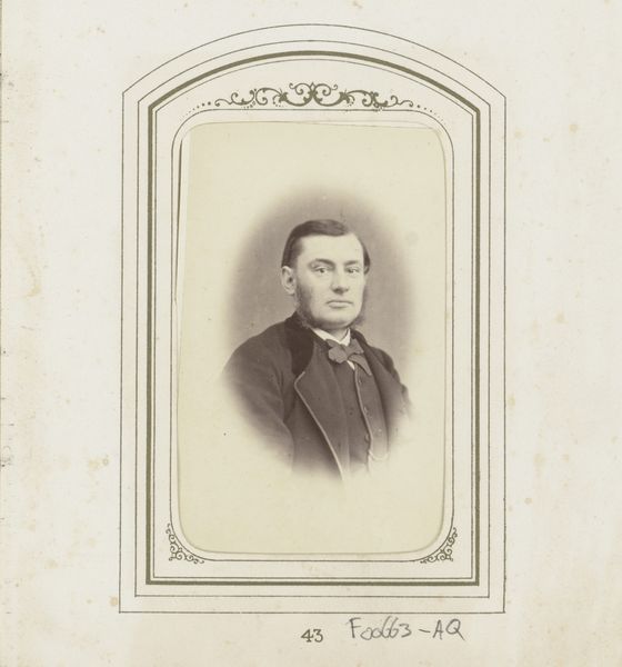 Curator: Look at this portrait. It's an old daguerreotype, taken by Heinrich Steinhauer sometime between 1863 and 1875, titled rather simply, "Portret van een man," or "Portrait of a Man." Editor: He looks like he’s swallowed something bitter! Honestly, there’s this air of subdued… melancholy? Everything's quite contained, and the frame feels almost too ornate for such a somber fellow. It is a very composed image though, very neat! Curator: Melancholy, yes, I think that's captured quite well. Consider the era. Daguerreotypes, those early photographs on silvered copper plates, were painstaking. The subject would have had to sit very still, not a twitch! That forced stillness adds to that reserved, slightly burdened air you perceive. There's also the social expectation for these photographic portraits to represent oneself respectably. Editor: True. There's an inherent constraint, a pressure to perform a certain stoicism, a 'proper' portrait of oneself in the 19th century. That makes me think, what wasn't captured in this little square? What stories are bubbling beneath that serious stare? And who was he really portraying himself to be: his social aspirations, or something deeply intrinsic? Curator: That's where photography intersects with the grand tradition of portraiture. Think of all those royal portraits in the Renaissance. Those, too, were careful constructions of power. The rise of photography democratizes the medium; a middle class man, rather than a royal subject, is now being framed as the center of his own universe. I wonder if the almost ghostly fade in the photograph helps highlight the man? Editor: Ah, I hadn't considered the impact of that fading quality on our perception of his status. To be honest, I find the fact that these images continue to be portals to other eras… It always makes me wonder if someone is one day going to view my profile picture and feel as empathetic as I feel now! Curator: Absolutely. Looking back, it's hard to divorce the aesthetic from all the social weight it carries. Editor: Right? These images really echo through the ages, and hopefully, make us reflect on what portraits continue to do for us today.