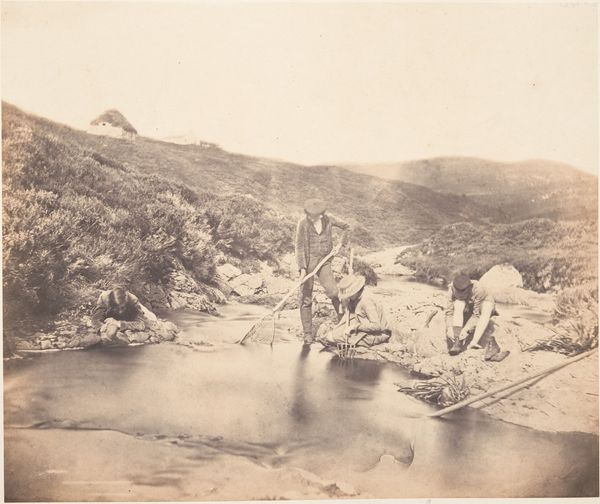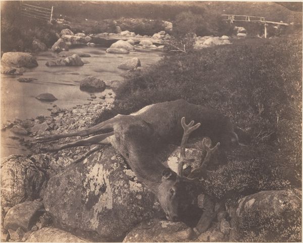 Horatio Ross's photographic print, likely made using the wet collodion process, freezes a stark scene. The body of a dead stag lies draped over rocks in a stream. Photography in the 19th century was a complex alchemy, requiring meticulous preparation and understanding of chemical reactions. Ross would have coated a glass plate with collodion, a sticky, light-sensitive emulsion, then exposed and developed it immediately. The final print, like this one, captures incredible detail, while also bearing the marks of its making, such as subtle tonal variations and soft focus. Beyond the technical skill, this photograph speaks to the social context of the Scottish Highlands. The image suggests a controlled environment where nature's dominance has been challenged. The dead stag, posed almost as a trophy, reflects a culture of hunting as a leisure pursuit, accessible primarily to the landed gentry. In this context, photography itself becomes a tool to capture and display a certain kind of power over the landscape and its creatures, blurring the lines between art, sport, and social status.