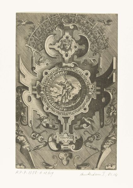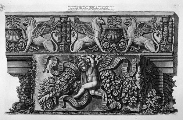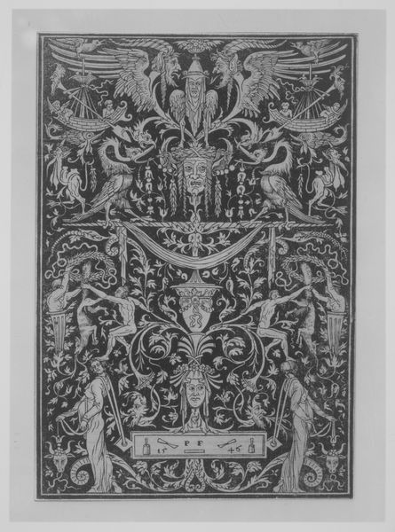 Editor: So, this is a "Chair Panel," probably crafted between 1700 and 1715. The Met attributes it to Daniel Marot the Elder, though I imagine workshops were involved in these things. It's described as drawing, textile and sculpture, which sounds unusual! What strikes me is its sort of... exuberant formality. I mean, it’s baroque on steroids, right? What do you make of it? Curator: Exuberant is a wonderful word! And steroids are involved, I think – aesthetic steroids! It's so densely packed with symbolism and aspirational grandeur. Look at the two burly fellows holding up what appears to be an embroidered scene... they are not so subtly suggesting the weight and importance of the person meant to sit on this chair, or perhaps rather, whose derriere will be bestowed upon it. Now, doesn't this level of overt display make you consider power, status, maybe even anxieties of the time? Editor: Anxieties? I hadn't thought of it that way. I was stuck on the shell motif up top, kind of campy but very Neptune, and then the weird little dangling bits hanging underneath that other winged head! Are those tassels or... plumb bobs? Curator: (chuckles) Well spotted. Those “dangly bits” contribute to the visual vocabulary; maybe tassels for pomp, and plumb bobs to ensure...level-headedness of the sitter? All playful guessing, of course. But Daniel Marot was a master of creating a stage. How fascinating to ponder this theater on a chair back. It makes one want to write plays just for furniture! Editor: So, beyond the status signaling, is there something... rebellious even? Poking fun? Curator: Rebellious! Interesting idea. Perhaps. These were complicated times and maybe Marot's tongue was only slightly in his cheek as he concocted this theatrical riot for the sitter's approval and comfort. Editor: Hmmm. Baroque on steroids AND subtly subversive! I like that idea, somehow. It just adds another layer of intrigue to all this... busyness! Curator: Exactly! It is an exuberant busyness that hopefully nudges us to see beyond the decoration and to wonder about the world the piece embodies, or wishes it could.