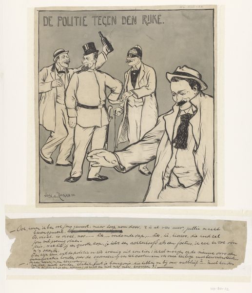 Editor: This is an intriguing ink drawing titled "'t Dronken gezag en de overmoedige geldmacht houden een lijkendans," created sometime between 1875 and 1900 by Jan de Waardt. The caricature style gives it an unsettling yet darkly humorous mood. What strikes me is the way the artist uses stark contrasts in the shading to almost stage the figures. How do you interpret this work? Curator: The potency of this piece resides primarily in its compositional arrangement. Observe how the artist positions the three figures – drunken authority, corrupt wealth, and Lady Justice – to direct the eye across the plane. The diagonal momentum pulls the viewer from the impartial, though perhaps ineffectual, justice towards the chaotic dance of power and greed. Editor: I notice Lady Justice seems detached, while the other figures are dynamic and intertwined. Is this purposeful? Curator: Precisely. The formal element of line contributes significantly. Note the frenetic, almost scribbled lines that define the figures of authority and wealth versus the static, clean lines of justice. This deliberate contrast in linework serves to emphasize the corruption and disarray caused by their actions, with a sobering effect achieved by Lady Justice's form. It subtly highlights the imbalance of power. Editor: So, it is the visual arrangement of the artwork's elements that underscore the themes of justice and corruption? Curator: Yes, by focusing on the interplay of line, form, and composition, the drawing allows the viewer to critically consider this interplay of corruption versus authority in what we might see as the timeless performance of such imbalances. It compels the audience toward critical reflection. Editor: I appreciate the focus on the visual. Thinking about the work as a stage for these relationships really clarifies its message for me. Curator: Indeed. The absence of color underscores the gravity. And perhaps a commentary on a kind of formal "purity," something ironically devoid in their 'dance'.