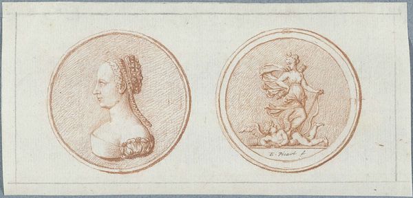 Curator: Welcome. Before us is a fascinating engraving from 1768, "Penning met portret van Willem V, prins van Oranje-Nassau, en Wilhelmina van Pruisen," housed here at the Rijksmuseum. Editor: It has a rather austere and stately feel about it, doesn't it? The stark contrast and rigid circular forms evoke a strong sense of formality. Curator: Indeed. Observe how the meticulous, tightly controlled lines define the profiles of Willem and Wilhelmina. Notice also the symmetry in its overall construction, with its almost diagrammatic arrangement of the Prince and Princess flanking heraldic symbols of rulership. Editor: The symbols on the coin are so telling—that cherubic figure, almost aggressively holding up a shield, coupled with what looks like an open book and some bundles—fascinating. The composition really divides neatly, with the sitters clearly partitioned from these emblems. Curator: Precisely. The visual division signifies not only power but, considering this piece aligns with the rise of Neoclassicism, a calculated return to order and idealized representation. It reflects an ambition for balanced forms, visually signaling that order, in fact, has triumphed in this new society. Editor: Beyond that immediate feeling of formal constraint, one can trace cultural touchstones: a cupid guarding a heraldic coat of arms suggests ideas around love, lineage, and duty—very much intended to broadcast themes of leadership and posterity. Curator: It underscores a sense of dynastic permanence that wealthy or politically important families yearned to cultivate through commissioned artworks. This portrait, essentially a piece of reproducible media given its existence as an engraving, democratizes visual imagery and gives broader recognition of prominent aristocratic images across the populace. Editor: The strategic placement of the wreath hints at victory or triumph. Taken alongside the other symbols, the Prince and Princess present as figures closely affiliated with strength and providence. Even this small, token object speaks volumes, as symbols resonate even on the micro-scale. Curator: Absolutely, and seeing the nuances emerge from what seems at first to be merely representational unlocks for me the potent interrelationship between aesthetics, class, and power at that precise moment in history. Editor: And for me, that's how symbolic and affective connections deepen our insight into not only Willem and Wilhelmina, but how art like this becomes an evocative mirror, and helps us question our own ideas and investments surrounding authority and status.