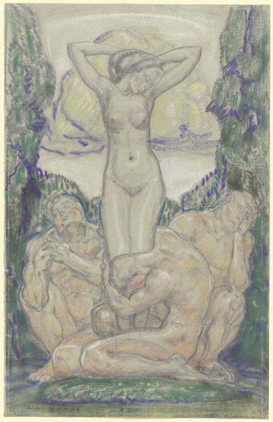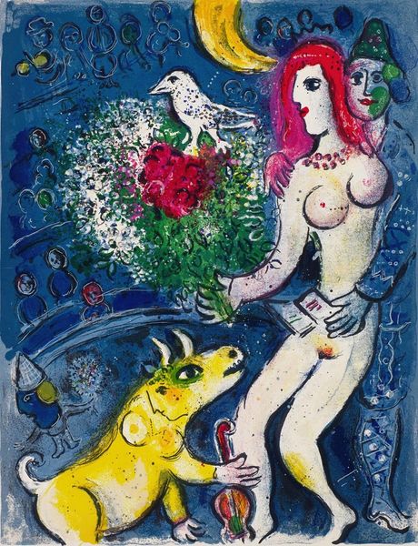 Marc Chagall's "For a Woman, What Remains" presents a dreamlike scene, realized through etching with watercolor. The composition is structured around intersecting circles, framing various figures and creatures in a dynamic yet enigmatic arrangement. The vibrant, yet diluted, watercolor washes give the scene an ethereal quality. We see a juxtaposition of the sacred and the profane, with a horned, sword-wielding figure standing opposite a nude woman embraced by another figure, while a red bull looms behind circus performers. Chagall uses a symbolic language which seems to destabilize conventional narratives. The figures float unbound, suggesting a rejection of fixed identities and meanings. This challenges the viewer to reconsider the relationship between the visible and the invisible, the real and the imagined. The ethereal quality evokes a sense of longing, while the fragmented composition mirrors the incomplete nature of memory and desire.