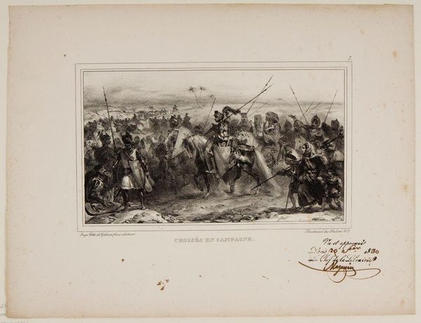 Curator: Here we have "Slag bij Leuven, 1831," a print by J.B. Clermans commemorating a specific historical event. Editor: My initial impression is chaotic energy, a real sense of the violence and confusion of battle conveyed through this very linear engraving style. It almost looks like a newspaper illustration, meant for wide distribution. Curator: Exactly. Clermans made this print in 1831, likely as a means of documenting and circulating a particular narrative surrounding the Battle of Leuven during the Belgian Revolution. Its function was largely public and propagandistic. Editor: So, not necessarily high art meant for an elite audience, but something meant for consumption by the broader populace. I am looking at the material reality—cheap printing, meant to be accessible. Do we know how these prints were disseminated? Curator: Given the political climate, prints like these would have been widely circulated in newspapers and as separate broadsides to galvanize support for the Dutch cause during the Belgian Revolution. Its reception would hinge on political leanings, I expect. Editor: Interesting how the "heroic" figures are on horseback, elevated both literally and socially above the fray. And the prone bodies… are those the ‘enemy,’ casualties for the 'heroic' prince to overcome? This image isn't neutral; it clearly takes a position. Curator: Indeed, and that touches on the socio-political function. Clermans is clearly presenting a romanticized, Dutch-centric view of the battle. Look at the Prince of Orange— the central figure—leading the charge, seemingly unharmed amidst the carnage. The entire image works to uphold Orange's image. Editor: So, a deliberate act of image-making intended to reinforce power structures. Understanding its production—the printmaking, the economic incentives—helps us understand its broader function. Who controlled its distribution networks is really what would have shaped this image's effectiveness. Curator: Precisely. When considering how and why artworks are created, understanding social and political forces and its intended audiences become very relevant to understanding its role. Editor: It also tells a story, albeit a very specific and biased one, of a particular time and place. Curator: Ultimately it illustrates that understanding these artworks involves dissecting production, political intentions, distribution and how they were embedded within socio-historical moments. Editor: An active reading of these prints shows that its materials allow it to participate directly in public discourse.