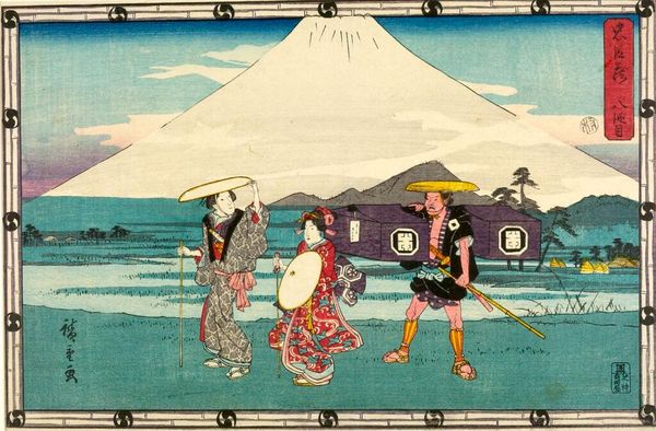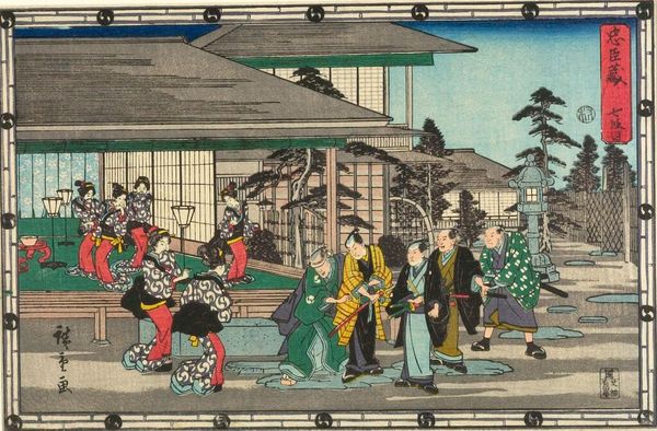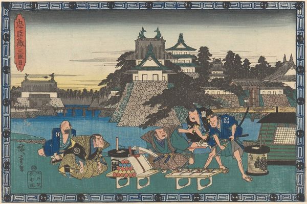 Curator: Looking at this print by Utagawa Hiroshige, entitled "Act Three from the series Treasury of Loyal Retainers," the first thing I notice is the frenetic energy of the scene. The colors are muted, but the dynamism is palpable. Editor: Yes, the rapid movements of the figures create a visual buzz. Hiroshige's approach to ukiyo-e seems to emphasize the socio-political tensions inherent to the Chushingura story. This act, particularly, hints at the brewing conflict. Curator: I agree. Consider the labor involved in producing these prints, and the market for them. What did it mean to consume these images of loyalty and revenge in a time of social upheaval? Editor: It's a way for the people to express their need for justice. The story of the 47 Ronin, veiled behind this kabuki series, becomes a tool to analyze the concept of honor and power within a rapidly changing society. Curator: It's fascinating to consider how the printmaking process itself—the labor, the materials—mirrored the social dynamics being depicted. The multiple hands involved in its creation reflecting the collective action of the retainers. Editor: Absolutely, and Hiroshige frames that collective action within a complex social and political landscape. This composition reminds us that art is never neutral; it's always engaged in a dialogue with the world around it. Curator: The layered symbolism invites us to see beyond the action and delve into the complex values it represents. Editor: Indeed, and to question whose values are being represented and why.