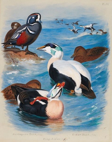 Editor: So, we're looking at Archibald Thorburn's "Eider Duck" from 1913. It’s incredibly detailed. I’m immediately struck by how lifelike the birds seem against the coastal backdrop. What can you tell me about what this painting communicates? Curator: This work captures more than just a pretty bird, doesn’t it? Consider the Eider duck itself. In many maritime cultures, ducks symbolize resourcefulness, adaptability, and a deep connection to the water. Think about it, these birds navigate both air and water, linking the conscious and unconscious realms, just as humans navigate different states of being. Editor: That’s interesting. So the location, the sea and land in the background, plays a role? Curator: Absolutely. Thorburn situates them at the edge of land and sea, representing a threshold. Look at the juxtaposition of the male, so strikingly white and black, standing erect, watchful, and the more muted brown female at rest, nestled into the landscape. Does this composition suggest any power dynamics or contrasting energies to you? Editor: Perhaps a division of roles? The male standing guard while the female rests. That makes me think of traditional family structures. Curator: Precisely! Thorburn wasn't just painting a bird; he was imbuing it with cultural significance, tapping into archetypes and societal structures familiar to his audience. He's painting a familiar world in microcosm. Editor: So it’s not just observation, but commentary. That reframes the entire work. I’ll definitely remember to look beyond the surface details next time! Curator: Indeed. Art invites us to delve into those hidden layers, to uncover the memories and meanings woven into its very fabric.