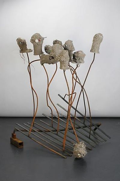 Curator: Alexander Calder's "Gibraltar," created in 1936, is a striking mobile. It is comprised of carved wood, metal wire and ceramic elements, carefully arranged. What strikes you first about it? Editor: Its playful, almost precarious balance. There's a sense of levity, defying the heaviness implied by the rough, hewn wood. It feels very grounded despite having those little ceramic accents dancing around it on the wire. Curator: Absolutely. Calder's genius lies in achieving that tension. Consider how the geometric forms – the sphere, the flattened ovals, the peak of the larger chunk of wood – interact. Each shape possesses a distinct spatial relationship. It's like a visual equation constantly resolving. Editor: The juxtaposition of materials is really key. The rough, weathered wood grounds it in a sense of process and history. You can imagine the artist selecting each piece for its individual character, its own inherent story. Then adding in the refined manufactured metal and these perfectly rounded ceramic balls. How does that tension speak to you? Curator: It’s an intentional contrast, highlighting form over any narrative intention. The mobile pushes the boundaries of sculpture and introduces movement. It becomes an ever-changing composition of lines and shapes. I look at it in relation to some of Mondrian's works around the same time. You see Mondrian, with a different objective of course, is pushing line. It seems to be in dialogue with that type of thinking. Editor: It reminds me of found-object art from that same time, like Kurt Schwitters, especially when considering it being assembled in 1936. Materials become storytellers here. Was the metal readily available or scarce at the time? The economic implications of those choices in materiality speak loudly. I agree there are tensions between form and materials as well. It's less about inherent qualities of materials and more about industrial versus natural objects and how we assign value to the object. Curator: An astute observation. The balance and play of materials—both formally and culturally—yields endless interpretations. Thank you for sharing. Editor: Indeed. It underscores that the power in Calder is finding elegance in how humble materials can challenge our understanding.
