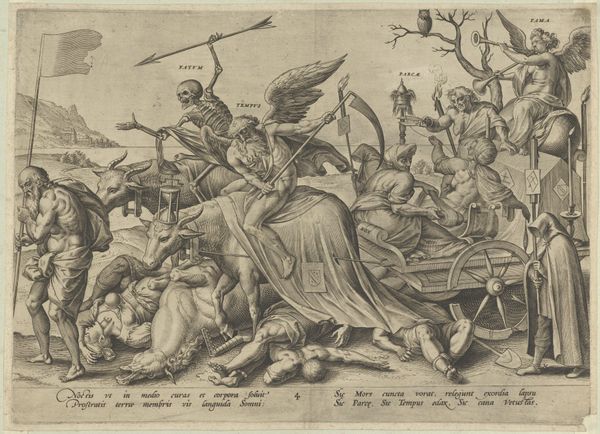 Editor: This is a copy of Albrecht Durer's "Knight, Death, and the Devil," created between 1485 and 2009. It's an engraving, full of such dark and intricate detail, and housed right here at the Metropolitan Museum. The more I look, the more I notice. But what catches your eye about this intense scene? Curator: Ah, Durer! I'm always struck by how he packs so much into a single image. Forget the 21st century! Look at the detail in the knight’s armor, the way he uses light and shadow. I see a story unfolding… tell me, does the knight seem afraid? Editor: Not at all! He looks… resolute. But the figures around him—Death with his hourglass, that devilish creature—they seem intended to intimidate, don't you think? Curator: Precisely. Durer's reflecting on the Christian concept of salvation, right? This knight, riding through darkness, embodies faith, courage, perhaps even divine purpose. He’s armed against worldly temptations, you see? And those temptations… they’re rather terrifying, aren’t they? He strides fearlessly toward his…destiny. Editor: I suppose I hadn’t thought about it in terms of faith, more in terms of… doom. The skull and bones in the lower left really hammer that home. It seemed like a morality tale or maybe a memento mori? Curator: Yes, the memento mori aspect is very relevant! It is a symbol of transience, that worldly vanity should be resisted… It’s Dürer reminding us, “Hey, life’s fleeting, make sure you choose the right path!”. Does knowing that give you a different view of the work, then? Editor: Absolutely. Now it reads less like a descent into darkness, and more like a triumphant journey, maybe, to something beyond? Thank you, that adds such richness to this copy of Durer’s work. Curator: My pleasure! And remember…even darkness has its details if we’re willing to look close enough.