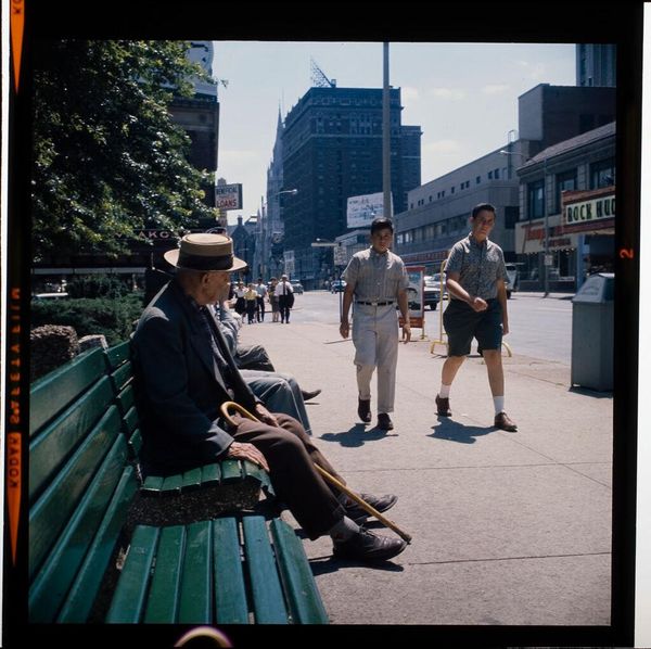 Editor: Richard Gordon's "Market Street, San Francisco," taken between 1973 and 1978, is a fascinating capture of urban life in black and white photography. I’m immediately drawn to how the different textures and forms—buildings, vehicles, and people—intersect. How do you interpret this work? Curator: Looking at this photograph through a materialist lens, it’s intriguing to consider the labor and social structures that went into its making and circulation. Think about the silver halide crystals on the film, the industrial processes to create both the camera and the photographic paper. What kind of economic landscape is captured? Editor: Well, I see a very busy city street, lots of different kinds of buildings and businesses... the older cars and the clothing styles. It seems to point to the contrast between a rapidly changing skyline and enduring social habits. Curator: Precisely. And what about the subjects themselves? Their attire, their roles in this urban theater? Who is included in this view, and who is excluded? Also, it is not clear from the image itself when it was created - and why choose monochrome? How do these specific photographic choices affect the narrative presented? Editor: I suppose the sharp contrast draws attention to economic divisions, highlighting both the wealthy in the stores and possibly lower income people on the streets trying to earn a living. Choosing black and white helps capture that division, by drawing attention away from glamour. Curator: Exactly. Considering how it was made invites us to analyze the entire economic and social apparatus represented within the image itself, don't you agree? Editor: That makes so much sense! Considering the photographic production along with subject really deepens our understanding of the photo and its social impact. Curator: Indeed. Material analysis brings to light the hidden socioeconomic layers that shape our perception of reality. It moves the focus to what is really depicted in an artpiece, the everyday material conditions.