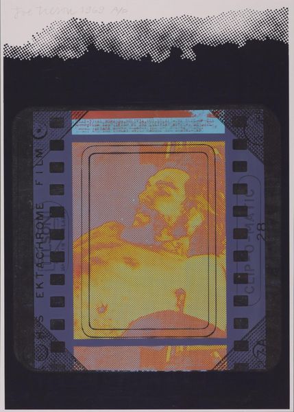 Curator: Well, I'm immediately struck by the jarring juxtaposition of the mundane and the cosmic. It's like a Hollywood smile filled with the entire universe! Editor: Indeed! This is Joe Tilson's "Transparency, Clip-o-Matic Lips". The piece, from the Tate collection, uses mixed media to achieve this effect of Pop Art meets interstellar wonder. Curator: The "Clip-o-Matic" part... it almost feels like a playful take on consumerism. Like beauty and identity can be manufactured. Editor: Precisely. The film strip motif framing the image draws attention to the mediated nature of representation itself, while the glittering cosmos hints at sublime depths hidden beneath the surface. Curator: It’s unsettling, but also, kind of beautiful? Makes you think about all the layers we present and what truly lies beneath. Editor: That contrast, that tension, is where the art lives. I find myself reconsidering how simple surfaces can hint at the complex and infinite.
