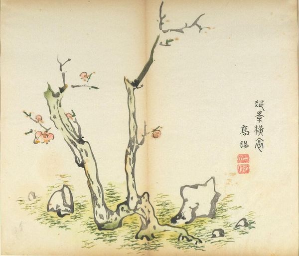 Curator: This is an illustration called "Plum Blossom Branch and Rocks" by Hu Zhengyan, from his "Ten Bamboo Studio Manual of Calligraphy and Painting." Editor: It feels so minimal, almost stark, yet there's this quiet resilience suggested by the blossoming plum against the rough rocks. Curator: Exactly. The manual, published in the 17th century, was a pattern book intended to popularize sophisticated printing techniques and artistic styles. It democratized artistic knowledge. Editor: The plum blossom is deeply symbolic, isn't it? A sign of perseverance through winter, a promise of spring. Here, it feels especially poignant next to the weathered rocks. Curator: Yes, the image reflects a broader trend in Ming dynasty culture—a turn towards more individualistic and expressive modes of art-making, challenging orthodoxies. Editor: Looking closely, I see how the artist uses simple forms to create a feeling of age and endurance. It speaks to a deeper connection with the natural world. Curator: Indeed, and it's fascinating to consider how such a small image could carry such weight in shaping artistic trends of the time. Editor: A tiny window onto a larger cultural landscape, then? Something to contemplate.