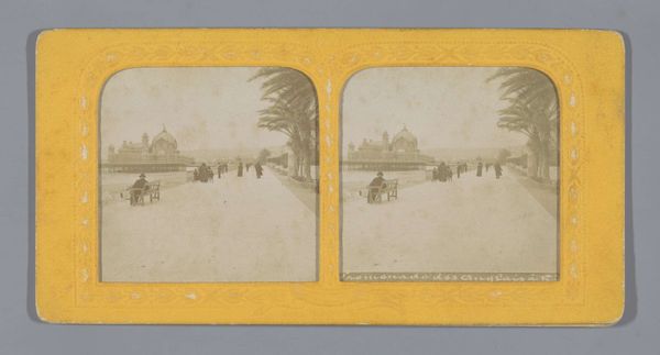 This stereoscopic card by an anonymous photographer presents a view of the Brussels Zoo. The subdued sepia tones and symmetrical composition evoke a sense of classical order and measured observation. The repeated balustrades create a rhythmic horizontal emphasis, leading the eye towards the domed structure in the background. This architectural backdrop is softened by the out-of-focus effect, typical for early photography. The composition balances the foreground's tactile details with the background's more ethereal, dreamlike elements. The stereoscopic format invites us to question the nature of perception and representation. Is it mirroring objective reality or creating an idealised construct? Through this formal interplay, the photograph reflects a tension between scientific observation and aesthetic interpretation, characteristic of its time. It engages with how we understand space and representation, inviting continuous interpretation.