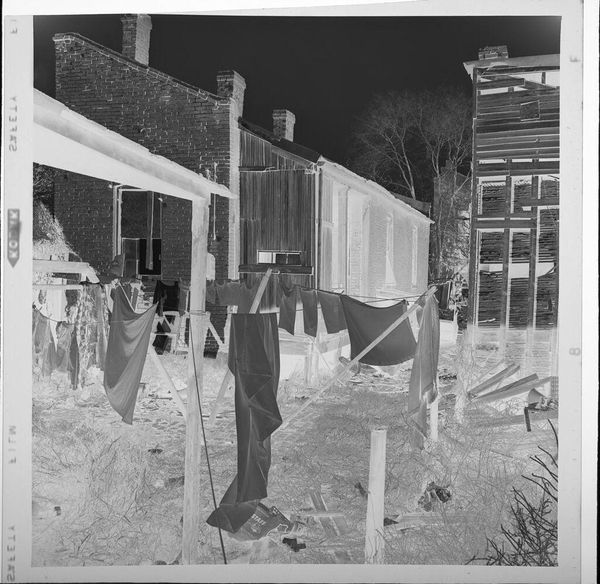 Curator: This intriguing photograph, attributed to Ben Shahn, is titled "Untitled (Pennsylvania?)". It's a small, almost ghostly, silver gelatin print housed here at the Harvard Art Museums. Editor: My first impression is organized chaos. The negative image creates a stark, almost unsettling contrast, yet there’s a compelling geometric structure in the lumber and scaffolding. Curator: Absolutely, the reversed tones emphasize the raw, utilitarian forms. Consider Shahn's focus on social realism; this could represent the plight and resilience of the working class. Editor: The composition, however, leans towards formalism. The stark lines and planes create a powerful abstract design, almost detached from its possible social context. Curator: But even in abstraction, the presence of building materials and scaffolding hints at the American dream, construction, and perhaps even its fragility. Editor: Perhaps you're right. Either way, it's undeniably captivating, regardless of whether you view it as symbolism or a visual puzzle.