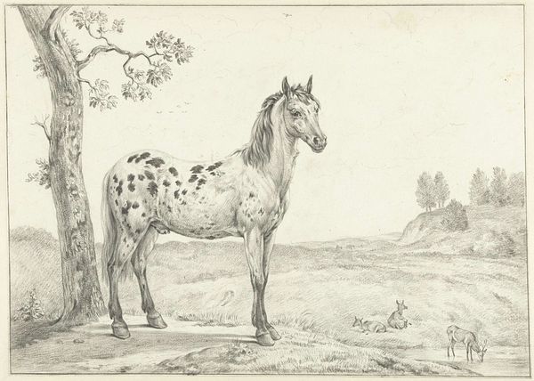 This is an engraving made by an anonymous artist, titled ‘Het gecoupeerde paard.’ The composition is bisected by the horizon line, creating two distinct spatial registers. At ground level, we are confronted by a foregrounded horse, set against a distant landscape, and a second, partial horse to the left. The horse on the right is a study in contrasts; its sleek neck leads to a body marked by irregular blotches, disrupting any sense of a continuous surface. The tail has been docked. This disfigurement points to a manipulation of form. There's a subtle commentary on control, where the natural is reshaped to meet external demands. The image is less about the beauty of the animal and more about the power dynamics embedded in its portrayal. Consider the interplay between natural representation and constructed intervention and what this says about our relationship to the world around us.