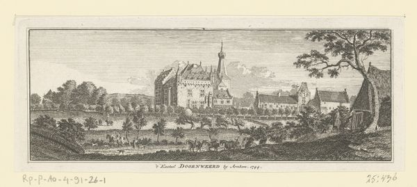 Curator: This is an etching by Johannes van Hiltrop, dating from sometime between 1774 and 1814. It's called "Gezicht op de stadspoort van Wijk bij Duurstede," or "View of the City Gate of Wijk bij Duurstede." Editor: Well, it certainly feels like stepping into a storybook. I get a strong sense of gentle bustle, life unfolding at a slower pace. The fine lines give it a dreamlike quality. Curator: That "dreamlike quality" probably stems from the neoclassical style which favors clarity and order. See how the gate is centrally located? It almost splits the scene in two halves. This etching shows not just a place, but also communicates ideas about civic pride and established order. Editor: Yet, there's a sense of informality. Look at the characters clustered near the gate; the figures milling about, a casualness which feels relatable, almost timeless. Are they trading gossip or bartering wares, or just enjoying the sun? It's like peeking at their daily lives, centuries ago. Curator: These city gates in older times also signified the boundaries of jurisdiction and protection. Note the coats of arms adorning the archway of the gate? They project power, and authority. These structures marked literal and symbolic limits. Editor: What interests me most is how little has changed. Sure, the clothes are different, the carriages are horse-drawn, but people are still meeting and talking. Places such as these are meeting points which remind us of humanity's continuity through history. The image connects me not just with history, but with a fundamental idea. Curator: Yes, in essence these historical prints reflect aspirations toward an ordered and harmonious society, which, despite inevitable changes, perhaps reveals something constant about our shared human experience. Editor: It makes you wonder, doesn’t it, what future generations will find interesting about our own "city gates?" Curator: Indeed. It’s a reminder that we, too, are crafting images and symbols that will carry our stories forward.