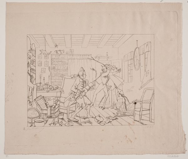 Moritz von Schwind created "The Dog's Friend," a drawing, with graphite on paper. The composition, though seemingly simple, draws us into a rustic interior. The sparse lines sketch out a room filled with everyday objects, yet it's the arrangement that intrigues. Notice how von Schwind uses linear perspective to structure the space. Our eyes are drawn to the seated man, pipe in hand, surrounded by the modest trappings of his life: shelves stacked with dishware, simple furniture, and of course, his canine companions. The rapid, sketchy lines give us a sense of immediacy, as if we've stumbled upon a private moment. The rough, unfinished quality destabilizes any attempt at idealization, instead presenting a candid slice of life. In its form, "The Dog's Friend" is a testament to the beauty found in the unadorned, prompting us to reconsider the value we place on the polished versus the raw. It invites us to find meaning not in grand gestures, but in the quiet corners of existence, in the simple act of companionship.