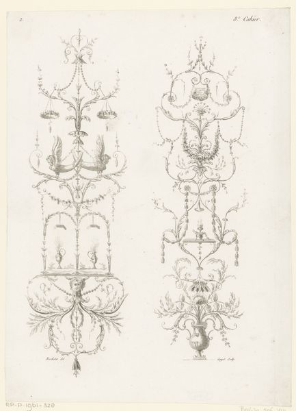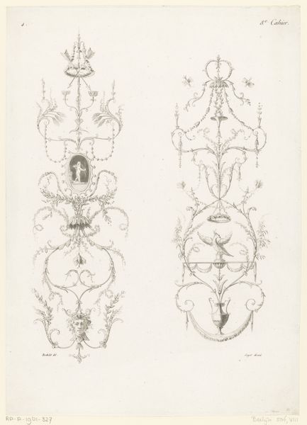 Editor: This drawing, "Arabesken met rookvat en vrouw," created around 1788, showcases arabesque designs rendered in dry media. The cool restraint of neoclassicism really sings in these symmetrical, fantastical arrangements. What's your take on it? Curator: The drawing dances on the edge of dream and design, doesn't it? Those arabesques, like thoughts taking flight, curl and unfurl with a delightful precision. Look closely; on the left, a censer exhales a plume, a wispy cloud crowning a garlanded altar, almost as if inspiration itself is being offered. The nude woman, almost floating on the right side? The composition suggests something akin to spiritual elevation, a floating dream state. Tell me, does it invoke feelings of harmony? Editor: Yes, very much so. There is a certain balanced harmony within it. So the work is more than mere decoration? Curator: Precisely. In that period, the Neoclassical style loved to use ornament as carriers of coded messages. Consider it a silent language spoken through flowing lines, symbolic figures and thoughtfully designed space. Each element whispers something; the smoke suggesting transformation, the nude figure evoking grace or innocence, all woven together into this complex, thoughtful design. Editor: So much symbolism packed in, presented with what I perceived initially as a simple decorative format. I'm seeing how much my initial assumptions were completely overturned. Curator: Isn't that the great joy of art, that persistent unveiling? To discover there’s more than meets the eye, the longer we observe it? Editor: I certainly feel that today! It just shows that art is always more complex and interesting than we might at first assume.