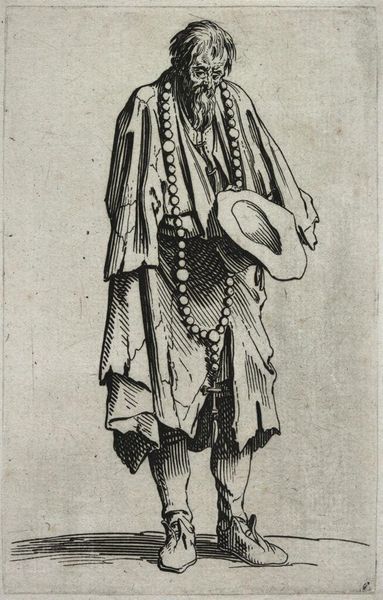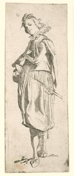 Editor: Here we have "Standing Man with Cape" printed by Isaac Weissenbruch sometime between 1836 and 1912, housed right here at the Rijksmuseum. It looks like an engraving on paper. There's something quite striking about the detail rendered with what must be relatively simple lines. How does the formal composition speak to you? Curator: Immediately, I note the density of line and hatching creating a play of light and shadow, structuring the subject's form. Consider the texture implied within the sweeping folds of the cape versus the relative smoothness of his face and the delicate lines describing his features. The print is not merely representational; it's a study of contrasts achieved through masterful manipulation of the medium. Do you see how the lines create depth? Editor: Absolutely, I can see that, but there's a static quality too – like a posed photograph. It makes me wonder, how does it capture a particular moment? Curator: The ‘moment,’ is achieved not through narrative, but through form. Observe how the line, through its direction and weight, sculpts a sense of weight and presence. It's in the relationship between the solid, darker masses and the lighter, more open spaces. Does that emphasis on form change how you see its ‘stillness?’ Editor: I see what you mean, the strong contrasts draw me into different points and create movement that way. So it's less about telling a story and more about the pure artistry in the details. I hadn't really considered it that way initially. Curator: Precisely! Art exists not merely to depict but to demonstrate mastery over its materials and methods. Form is the ultimate content. Editor: Thanks for shifting my perspective. I'll definitely look closer at other engravings now, paying attention to line and form, not just the overall picture.
