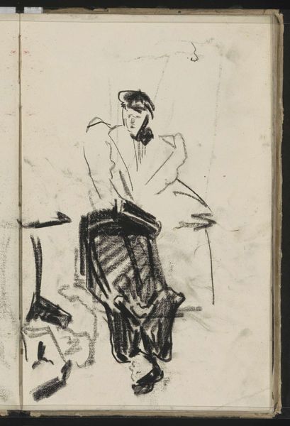 Curator: We’re looking at "Lopend meisje in een jurk", which translates to "Walking Girl in a Dress," a pencil drawing on paper by Carel Adolph Lion Cachet. It's held here at the Rijksmuseum. Editor: It's interesting how Cachet uses such minimal lines to convey movement. There's a looseness to it; the dress seems to billow as she walks, even though it's just a few strokes. The sketch quality gives it a feeling of immediacy. Curator: The rapid execution suggests this may be a preparatory study or a quick observation from life. Cachet was known for his work in graphic design and textile art, which informs how we interpret this work. It gives insight into the artist's methods of production and the potential mass production of images that the style allows. Editor: I see how this relates to textiles—the dress's form certainly echoes the draped fabric. But taken on its own, the composition fascinates me. The balance between positive and negative space creates an intriguing tension. Note the intentional ambiguity in the depiction of the girl's face. Curator: That's a valid point. Consider, though, the accessibility of art supplies during that period and what kind of patronage the artist would need. Was he beholden to a certain aesthetic or buyer? Cachet’s labor, then, involved negotiating various constraints. Editor: While social conditions undoubtedly influenced his practice, let's return to the work's internal structure. Look at the varying line weights! Some are bold and confident, others light and suggestive. It almost feels like two distinct visual languages coexisting on one plane. Curator: Agreed! By exploring the materials used and Cachet's possible inspirations—what he had read or seen—we gain perspective. Who were the intended audience, and did those who consumed it also create it? That's my focus. Editor: And for me, the drawing serves as an investigation into form and perception, showcasing how little information our eye needs to create a complete, evocative image. Curator: It all sheds a bit of light on the artist, wouldn't you agree? Editor: Indeed. I leave today considering form anew.