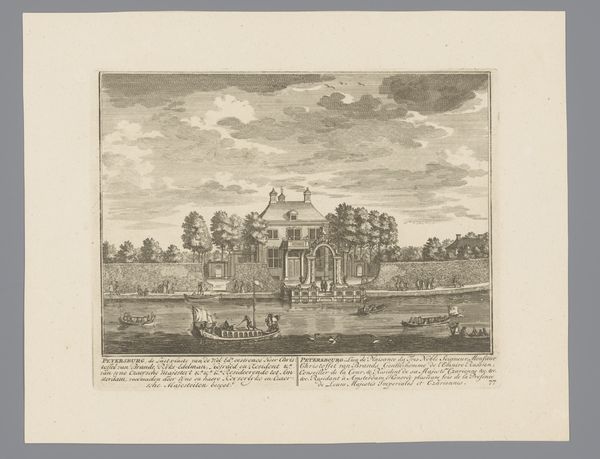 Daniël Stopendaal created this print titled "View of Vechtwijk" in the Netherlands during the late 17th or early 18th century. It depicts a leisurely scene on the Vecht River, showcasing the estate of a wealthy individual, likely a merchant or member of the Dutch elite. The image offers insights into the social and economic landscape of the Dutch Golden Age. The presence of pleasure gardens and elaborate architecture reflects the prosperity and burgeoning merchant class of the period. The river itself served as a vital artery for trade and transportation, contributing to the nation's economic strength. The image makes it clear that this wealth was not shared by all. To better understand the painting, we might consult historical records, such as estate inventories, shipping records, or biographical information about the Stopendaal. These resources can provide a richer understanding of the social and institutional context that shaped the creation and reception of this image.