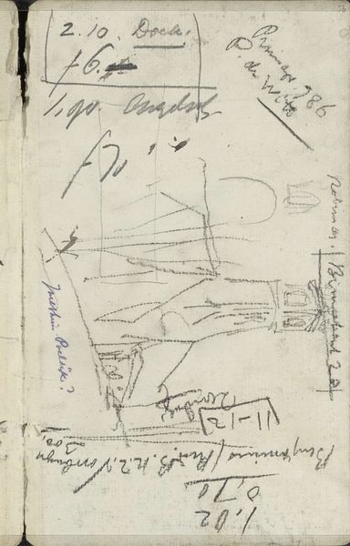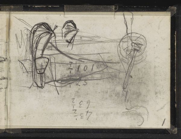Editor: Here we have "Cow and a Design for the International Bakery Exhibition," a pencil drawing from around 1905 by Carel Adolph Lion Cachet, held at the Rijksmuseum. The light pencil work gives the piece an ethereal, almost dreamlike quality. What do you see in this work? Curator: Focusing purely on its visual structure, observe how the artist employs line to create a sense of depth and movement despite the monochromatic palette. Note the juxtaposition of seemingly unrelated forms: geometric shapes alongside the organic rendering of the cow, which lacks detail. Ask yourself: how does the absence of detail guide the viewer? Editor: It feels a bit chaotic, almost unfinished. Is that intentional, perhaps reflecting the artist’s creative process? Curator: The apparent spontaneity is deceiving. Each line, though seemingly arbitrary, contributes to the overall formal arrangement. Notice the placement of the hand-drawn type, it both clashes with and complements the other elements, creating a certain visual tension. Consider the geometric shapes; what could they represent formally in relation to the lines depicting the animal and signage? Editor: So, the composition is more deliberate than it first appears, playing with contrasts and visual tensions... Curator: Precisely. Disregard the subject matter for a moment and examine the purely abstract qualities: the balance, the rhythm, the interplay of positive and negative space. These formal elements are what constitute the artwork’s fundamental language. Editor: That's a fascinating perspective. I initially focused on the subject, but analyzing its structure reveals a deeper level of artistry. Curator: Indeed. The artist employs form to communicate. What appears rudimentary at first glance invites close, prolonged analysis of its constitutive elements.
