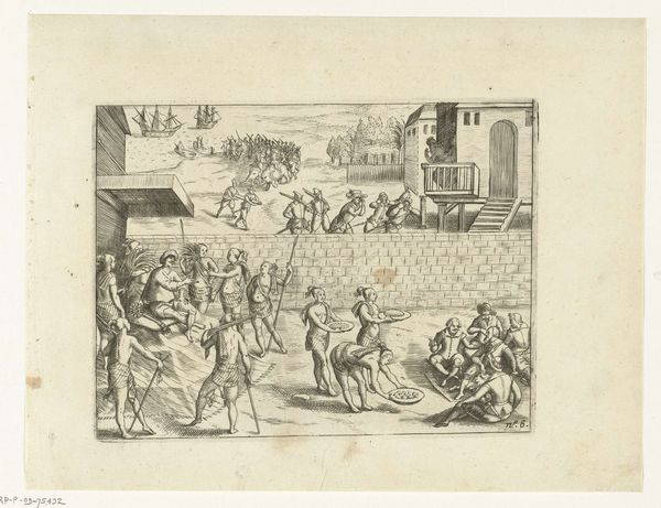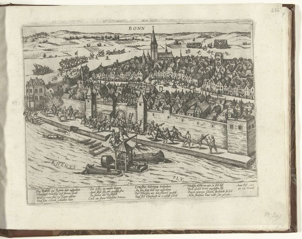 Curator: Look at this engaging print titled, "Aftocht van Spanjaarden uit Maastricht, 1577," created sometime between 1613 and 1615 by an anonymous artist. Editor: Immediately, the level of detail impresses me. There is a flurry of activity with that collective evacuation, a city breathes, relieved, in the background, and a quiet terror, no? I mean, look at the figures, the labor in every corner of the frame. Curator: It captures the Spanish retreat from Maastricht with striking precision. The meticulous lines forming this engraving serve the historical narrative, a powerful example of Dutch Golden Age printmaking and Baroque influence, wouldn’t you agree? Editor: Undoubtedly. Though, stepping back, the artist uses line and form here not merely to illustrate but to emphasize a certain… class anxiety? Look at the burdened porters; their struggle is nearly as central as the departing army itself. Are they leaving, or just carrying the luggage? Curator: Precisely, this is where I think about its place among landscapes and history paintings. There's a documentarian’s urge to record and an artist's yearning to give the history emotion, and meaning. Editor: It's craft used to deliver not just information, but an ideological perspective, too. What we see is very much made, a deliberate construction born of the tools used and the hand wielding them. I imagine how many prints were made and consumed? Who handled the inks and prepared the paper? It certainly wasn't any nobility. Curator: Good point. The engraving itself is also of significance; it democratized the scene, if you will. More accessible than painting, engravings spread ideas efficiently. Editor: And the skill is astonishing – to create depth, emotion, and social commentary using such a limited palette. It transforms something heavy into something very evocative and accessible. Curator: Ultimately, I think the image’s complexity leaves us pondering how to create, copy, and deliver, in times of turmoil and recovery. Editor: An apt observation. I am also now wondering about labor beyond the picture. From production, from consumption, so that it lives today.