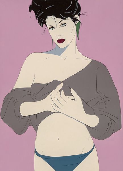 Editor: This is "Pin-Up with her Hair Up, #327" by Patrick Nagel, from 1983. It feels so emblematic of the 80s, and there's something almost intimidating about the subject's gaze. What's your interpretation of Nagel's work, especially regarding its cultural context? Curator: Nagel's aesthetic really embodies the intersection of art, commerce, and identity politics prevalent in the 1980s. His sleek, graphic style, often featured in Playboy and on Duran Duran album covers, presents a specific vision of femininity—one that's both powerful and hyper-stylized, yet also somewhat detached. Think about how feminist critiques of the male gaze were gaining traction then. Does this image reinforce or challenge those ideas? Editor: I can see both. She’s in control of her presentation, but there's still a sense that her image is being consumed, right? Like, it plays with the idea of objectification, maybe even highlighting it? Curator: Exactly. It's a paradox. The subject's sharp, almost severe features, combined with the simplified forms and cool color palette, create this aura of self-possession. But what does it mean to present such a controlled image? Is it empowerment or a submission to societal expectations? Editor: I guess I hadn't really considered it that way. It felt purely aesthetic. Curator: And that's precisely where it gets interesting. It invites a dialogue between the visual pleasure of his work and the underlying commentary on gender, power, and representation during the '80s, a time of burgeoning consumer culture and heightened awareness of social issues. How does that reframe your initial reaction? Editor: It makes me look at it with a more critical eye. It's not just a pretty picture. It's part of a bigger conversation about being a woman at that time. Curator: Precisely! And those are precisely the intersections that make art history so compelling. Editor: This has changed my perspective entirely, I need to go think more about the interplay between fashion, feminism, and image creation in the 80s.
