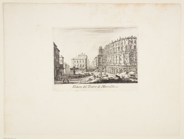 Editor: So this is "College of the Propaganda Fide. 1. S. Andrea delle frate. 2. Palazzo Bernini" by Giovanni Battista Piranesi, made sometime between 1741 and 1748. It's an etching. It has a somewhat austere feel to it; what do you see in this piece? Curator: What strikes me is how Piranesi uses architecture to communicate power, both ecclesiastical and political. The building itself, the College of Propaganda Fide, becomes a symbol. "Propaganda Fide," meaning "propagation of the faith," tells us about the Catholic Church's mission, its colonizing agenda through conversion. Editor: I hadn't considered the title in that light. So, the architecture isn't just beautiful, it’s…loaded? Curator: Exactly. And consider Bernini’s involvement – his palace incorporated here represents the powerful families interwoven with the Church’s authority. The cityscape, seemingly objective, is actually deeply embedded within these power structures. Who is represented here and, crucially, who *isn't*? How does the depiction of this seat of power shape perceptions of authority and influence? Editor: That makes me see the procession of people in front of the building differently. Almost like stage actors… Curator: Precisely! Piranesi invites us to consider the performative nature of power, its constructed reality. He asks us to consider not just the aesthetic but also the ideological. This "cityscape" then morphs into a critical commentary, wouldn't you agree? Editor: Absolutely. Thinking about it in terms of power and agenda has completely transformed my understanding of the piece. Thank you. Curator: My pleasure. It’s always about looking beyond the surface. Considering these contextual elements changes everything.
