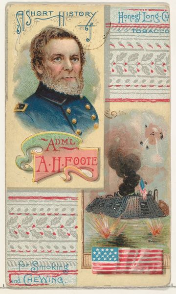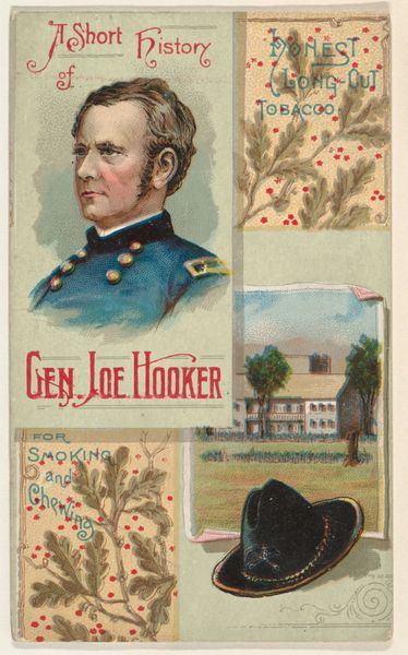 Curator: Here we have a curious piece from 1888. It's a promotional card issued by W. Duke, Sons & Co. for their "Honest Long Cut" tobacco, featuring General Henry W. Halleck. The card uses colored pencils and watercolor print. Editor: It strikes me as a rather unsettling juxtaposition—a military portrait alongside what appears to be a battlefield scene, all packaged as a promotion for tobacco. There's a tension between respectability and a gritty reality. Curator: Absolutely. Note the choices made for mass production and mass appeal; it seems to trivialize war. This tension speaks volumes about the post-Civil War landscape and how such events were consumed and marketed. Editor: The symbolism feels potent. Halleck, in his formal uniform, represents order and authority. Yet below, there's violence. A soldier stands guard over a fallen comrade. It's a stark reminder of the cost of that order, a visual memento mori lurking beneath the advertisement. Curator: And the act of smoking or chewing tobacco might have been associated with these idealized portraits in this context: images that gave some illusion of familiarity for consumers who enjoyed reading stories in newspapers about war heros like Halleck. Editor: It really asks you to consider the intent behind it all: what is the intention? Who is this imagery intended for? I also wonder if the war imagery has roots in earlier symbolism like vanitas, which remind us of human suffering. Curator: And by that logic, what message does it create for new customers about that suffering? Cigarettes will always be associated with leisure. Editor: It highlights how objects, even seemingly disposable ones like trade cards, become carriers of complex cultural meaning. Thank you. Curator: It serves as a reminder of how capitalist structures inevitably intersect with expressions of grief and war heros.