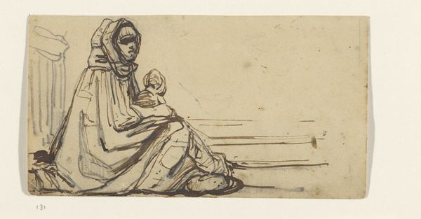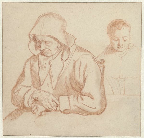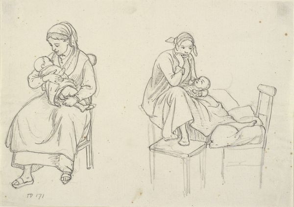 Curator: Here, we see Wilhelm Marstrand's pencil drawing from 1851, titled "Svensk pige med et barn på skødet"—"Swedish Girl with a Child in Her Lap," in English. Editor: Oh, it’s lovely, isn’t it? Such a simple composition, yet it evokes such a feeling of quiet intimacy. I love how the artist captures that fleeting moment of connection between a mother and child. Curator: Absolutely. Marstrand, associated with academic art, positions this image within a broader discussion around the idealized domestic sphere and gendered roles, particularly examining the representation of motherhood in 19th-century Scandinavian art. What's striking to me is how, within that idealized framing, one can trace anxieties about labor, class, and national identity. Editor: That's fascinating. For me, the drawing speaks more to the universal experience of motherhood, and you are absolutely right about the quiet sense of anxiety there. I'm really drawn to the soft, gentle strokes used to depict their faces. It’s so delicate. It feels incredibly human and intimate, even across time. I keep thinking about what she is thinking. Curator: Well, what do you suppose she might be contemplating? Her position and possibilities as a young working class mother within that specific historical and cultural landscape? Editor: Perhaps. Or maybe she is thinking about laundry day or how to make the potato harvest last through the winter. To me it feels more immediate, more like a moment suspended in time—what many mothers continue to feel and experience in the everyday pressures of motherhood. The weight of responsibility but also of connection and hope. Curator: I agree. While the simplicity of the scene can allow for an engagement with our own lived experiences and emotional connections, a deeper reading, grounded in social and historical context, enriches that connection by underscoring the cultural factors that informed its very creation, as well as the reception of it during Marstrand's lifetime and ever since. Editor: I love that idea. I guess in the end the drawing holds space for both those perspectives. You've definitely given me a lot to think about. Curator: As you have for me. Thank you.