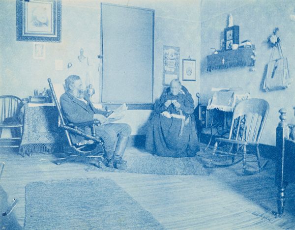 Agnes Winterbottom Cooney created this cyanotype, “Rulo,” at the turn of the 20th century, a period marked by significant shifts in gender roles. This distinctive blue photograph offers an intimate glimpse into domestic life, diverging from traditional representations of women. Here, a couple is shown absorbed in a newspaper, challenging the era's conventional images of women engaged in domestic activities or posed as objects of beauty. This everyday scene reflects the changing dynamics within households, influenced by the suffragette movement and evolving societal norms. Cooney, through her artistic lens, captures women's growing engagement with broader social and political issues. The cyanotype's blue hue lends a dreamlike quality, highlighting the subtle yet profound shifts in identity and power dynamics. It invites us to consider the personal and political dimensions of women's lives during this transformative period. It’s a quiet revolution, documented in shades of blue.