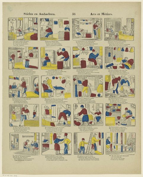 This color print titled "Luilekkerland / Pays de cocagne" was created by Philippus Jacobus Brepols, a Flemish artist, in the early 19th century. It depicts a series of vignettes illustrating a fantastical land of plenty, a topsy-turvy world where gluttony reigns. Brepols made this work during a time of significant social upheaval in Europe, as traditional hierarchies were being questioned. The imagery reflects both desire and anxiety around social mobility and economic change. In these scenes, the land provides without labor, reflecting a longing for a world free from scarcity, yet also satirizing the potential for excess and moral decay. The characters here, rendered in simple lines, seem caught between delight and absurdity. Consider the historical context in which Brepols created this work, and what it suggests about the values of the time. Are these scenes a vision of utopian possibility, or a cautionary tale about the pitfalls of unchecked desire?
