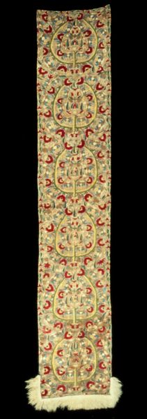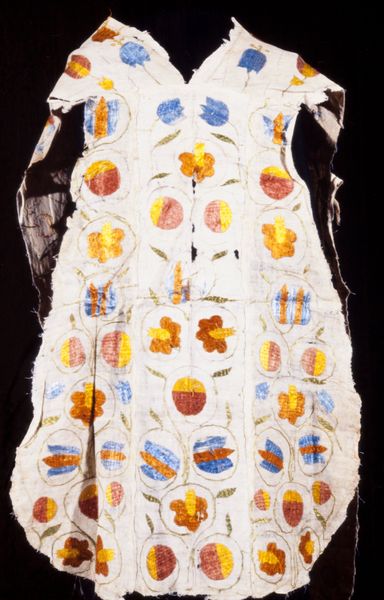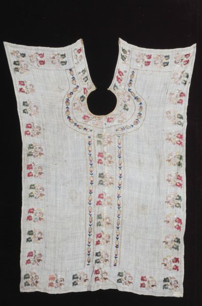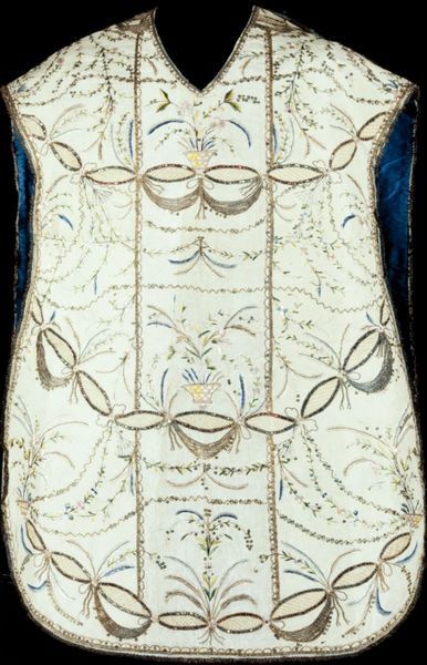 Editor: Here we have a chasuble, an ecclesiastical vestment, likely from the 18th century. It’s cotton, beautifully hand-embroidered with vibrant floral motifs. There's something so meticulous and devotional about the making of this garment. What stories do you think this piece could tell? Curator: Ah, stories woven in thread! Imagine the hands that meticulously placed each stitch, perhaps humming a hymn, a little like mindful meditation I'd wager. This isn’t just a decorative object, but an object that's been integrated into performance, ritual. It embodies faith, beauty, a shared experience. Notice the placement of the floral designs – like a secret language coded into the textile, perhaps hinting at specific saints, liturgical seasons, or, dare I say, the personal joys and sorrows of the embroiderer? Editor: That’s a wonderful perspective. The idea of it being coded is compelling! What about its connection to Baroque style and the decorative arts? Curator: Yes! Spot on. See how the overall exuberance points to Baroque, while that folksy botanical sensibility grounds it in decorative craft. You know, I find it fascinating how it balances grand visual impact with such intricate, intimate detailing. Does it perhaps even challenge our notions of "high" and "low" art, maybe even invite us to ponder where our separation truly began? Editor: I see what you mean, It's both ornate and somehow...accessible. Curator: Exactly! So glad you noticed that too, what can begin as grandiosity dissolves into sincere human expression. Next time you see detailed work like this, perhaps even reflect on your own approach to artistic expression, and whether to balance skill, expression, tradition and creativity! Editor: Thanks so much. That’s a fascinating thing to consider! It enriches our perspective not only in arts, but beyond, into personal and professional practices.