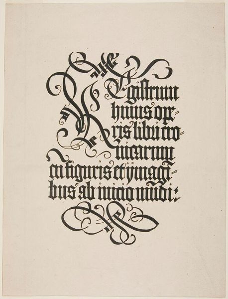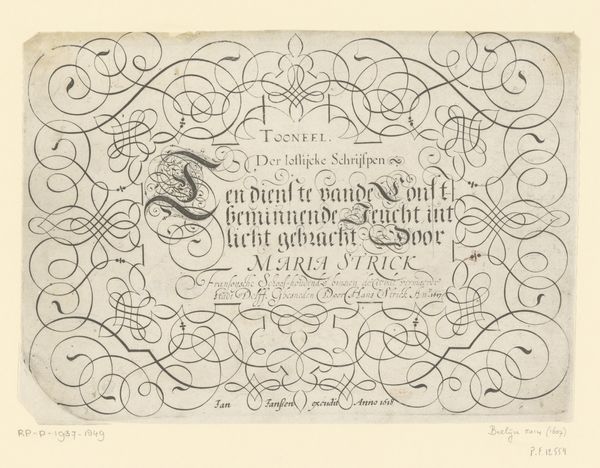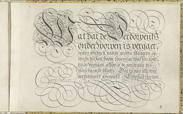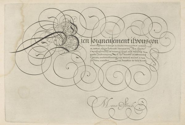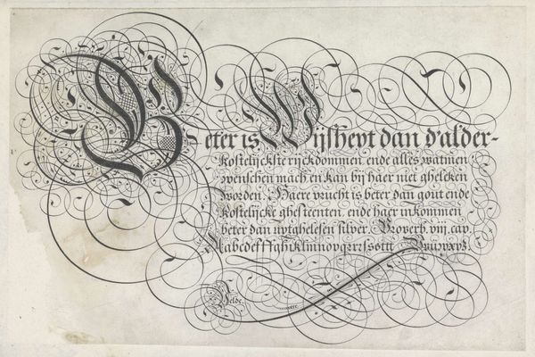 Curator: At first glance, I am struck by the elaborate curves, so dramatic yet delicate in their execution, it seems! Editor: Here we have Jan van de Velde the Elder's "Ontwerp van een schrijfvoorbeeld: Alle goede gifte (...)," created around 1605. It's currently held in the Rijksmuseum. Curator: Looking closely, the text becomes illegible, overshadowed by its own embellishment. It seems that the importance isn't what the words mean, but how they are formed. Is there some larger significance at play? Editor: It is written in Dutch, translating to "All good gifts and all perfect gift is from above, coming from the Father of lights with whom there is no change or shadow of turning.” We must remember that typography held a powerful place within the historical currents of 17th century Netherlands; with emerging merchant classes, religious reformation, a free press. Skill in lettering became a symbol of status, sophistication and theological grounding. Curator: I do like this reference to "light.” Looking at the flourishes surrounding the initial "A" at the top left— the tendrils feel like organic growth, possibly hinting at religious renewal, even divine intervention. The careful and minute cross hatching gives structure to a sprawling energy. Editor: Calligraphy in this era operated as both a craft and a visual expression of cultural values, of Christian faith and a personal commitment to spiritual enlightenment during a period of intense religious and social shifts. The looping and intertwining letters also evoke a sense of continuity and interconnection that go beyond mere visual decoration; consider its possible relation to feminist readings around weaving and women's traditional crafts as artistic expression. Curator: Interesting; I hadn’t considered how such detailed penmanship could carry these connotations. The design transforms the act of writing into a devotional act in itself. Editor: Precisely, we are witnessing visual testimony of intellectual, theological and artistic flourishing!