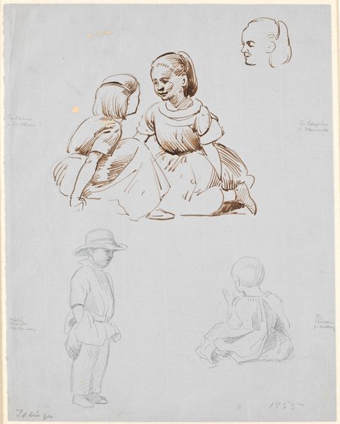 Editor: This is P.C. Skovgaard's "Study for the two girls and for her (right) head in the pictures 'Beech forest in May'," created between 1855 and 1858, using ink on paper. There's an intimacy about the piece... a hushed, whispered moment between siblings. What captures your attention most about it? Curator: Well, for me, it’s the way Skovgaard uses the stark simplicity of ink to capture not just a likeness, but a fleeting emotion. Do you see how the girls huddle together? There’s a real sense of shared experience, a secret held between them, even in the loose rendering of their forms. Editor: Yes, their connection is really palpable, even without a fully detailed background or context. But why include that isolated head study floating off to the side? Curator: Ah, the disembodied head. Isn’t it intriguing? To me, it suggests a contemplation of the individual within the shared moment. Skovgaard is teasing out the duality of connection and self – how we are both part of and separate from the relationships that define us. He captures something deeply human. Does that make sense to you? Editor: Absolutely! I was so focused on the two figures that I hadn't really considered that floating head as more than just a practice sketch. Now I see it as a representation of each girl's individual identity in the shared moment of the "Beech forest". Curator: Precisely! Skovgaard lets us peer into their private world, if only for a moment, reminding us of the tender dance between individuality and belonging.